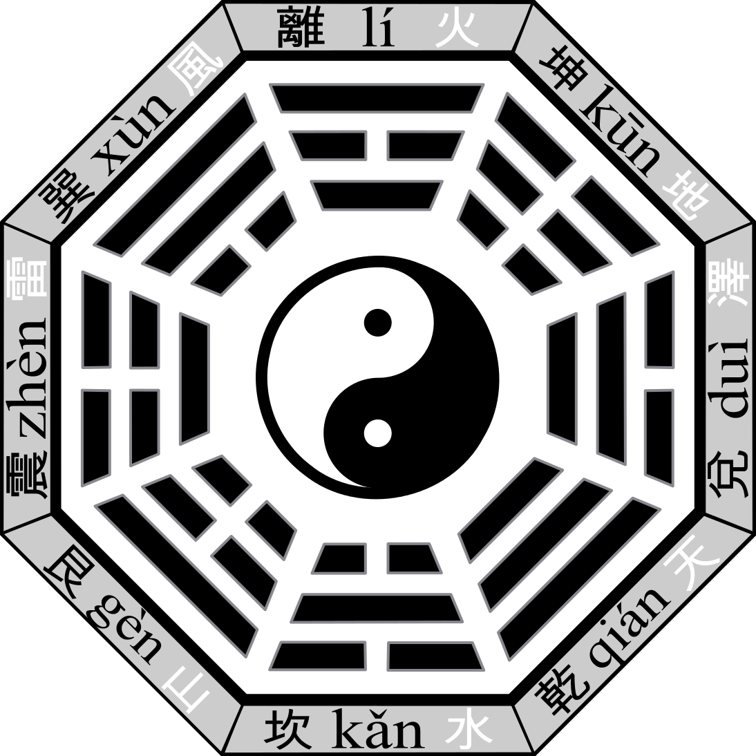 The traditional Bagua is composed of eight trigrams, which are sets of three lines arranged in different combinations. Each trigram represents a fundamental aspect of reality in Taoist cosmology. These trigrams are organized around a central point, known as the Tai Chi symbol, which represents the balance between yin and yang energies.